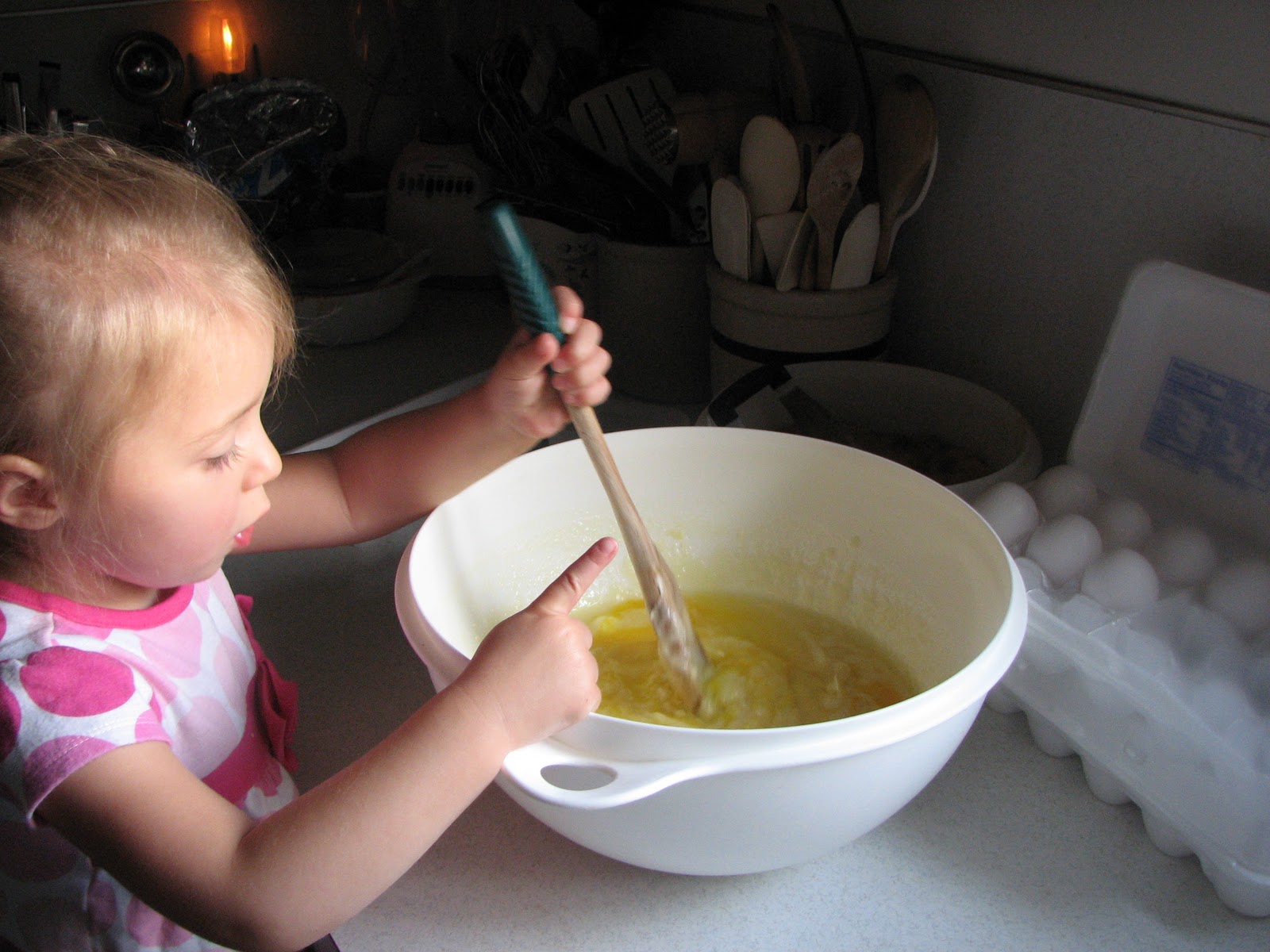 This process only took us three (3) hours. Chuckle, chuckle, chuckle. We were making the bread only a couple of days after both kids started living here... It took this grandma awhile to get use to again handling both an infant and a two year old. Mercy!!! Get this far, then Elliot wanted fed. Good, he's down for a nap. Back to the kitchen. Brain reminder - 'you MUST keep track of what Analyse is doing EVERY minute!' Hear Elliot - "what's up with only taking a twenty minute nap little guy?" Bring his bouncie seat into the kitchen and return to the task at hand. "Oh, you woke up so you could fill your britches, huh?" . . . I do believe that the process of taking three hours did help me enjoy the bread that much more! o;-p